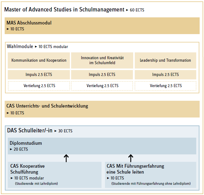 Im MAS Studiengang können unterschiedliche Wahlmodule belegt werden: «Interaktion und Kommunikation», «Leadership und Transformation» und «Entrepreneurship im Schulumfeld». Jedes Wahlmodul besteht aus einem Impulsteil und einem Vertiefungsteil. Der Impulsteil umfasst insgesamt 4 Tage Präsenzveranstaltungen (2.5 ECTS). Im Vertiefungsteil wird ein individuelles, themenverwandtes Projekt in der eigene Schule/ der eigenen Institution mit einer Coaching-Begleitung umgesetzt (2.5 ECTS).