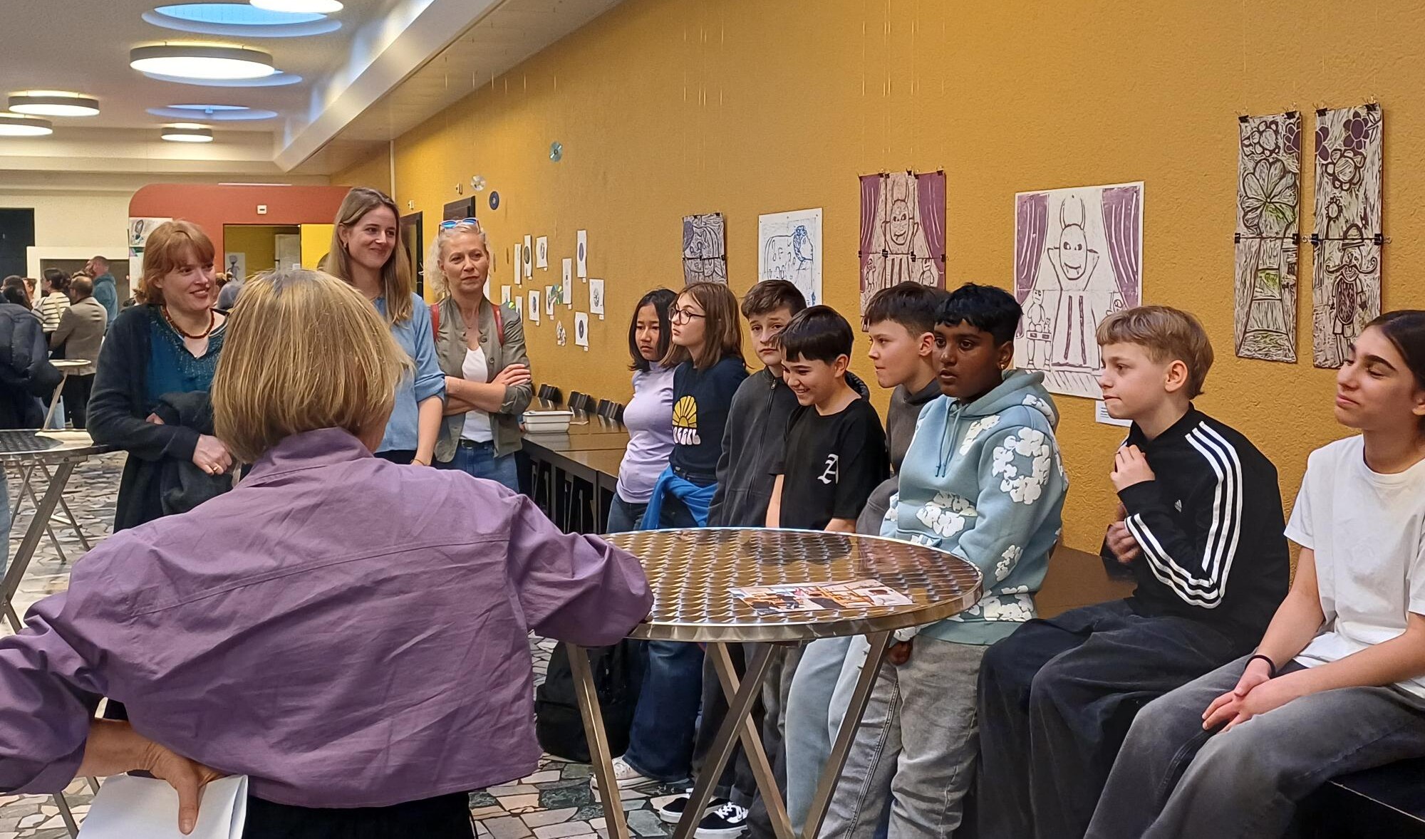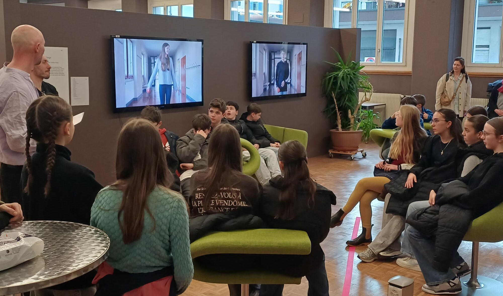 Im Atelier von Anđela Rončević lernten die Schüler*innen der 6. Klasse von Beatrice Odermatt und Anja Probst, Schulhaus Grenzhof, verschiedene Drucktechniken, Linoldruck, Kaltnadel auf CD und Tetrapack, kennen. Schülerinnen und Schüler wählten vorgegebene Figuren, Handlungen und «Superkräften» aus und setzten diese mit den verschiedenen gestalterischen Methoden um. Nikola Ilić vermittelte der 1. Sekundarklasse von Marc Wermelinger, Schulhaus Gersag, die Kunst des Filmens. Der Dokumentarfilmer stellte dabei das Thema Identität ins Zentrum, wobei sich die Jugendlichen mit den Buchstaben und dem Klang ihres Namens auseinandersetzten.
