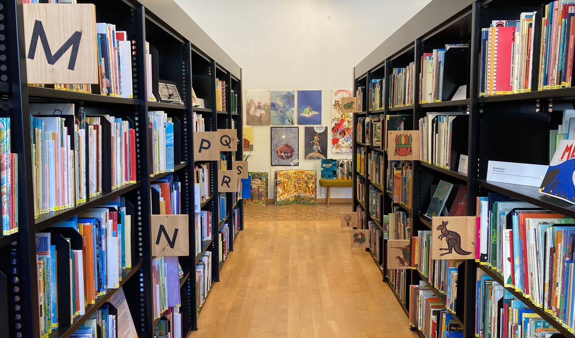 Die Plakate sind von den passenden Bilderbüchern aus unserer Sammlung umgeben – eine Einladung zum Entdecken, Stöbern und Schmökern.