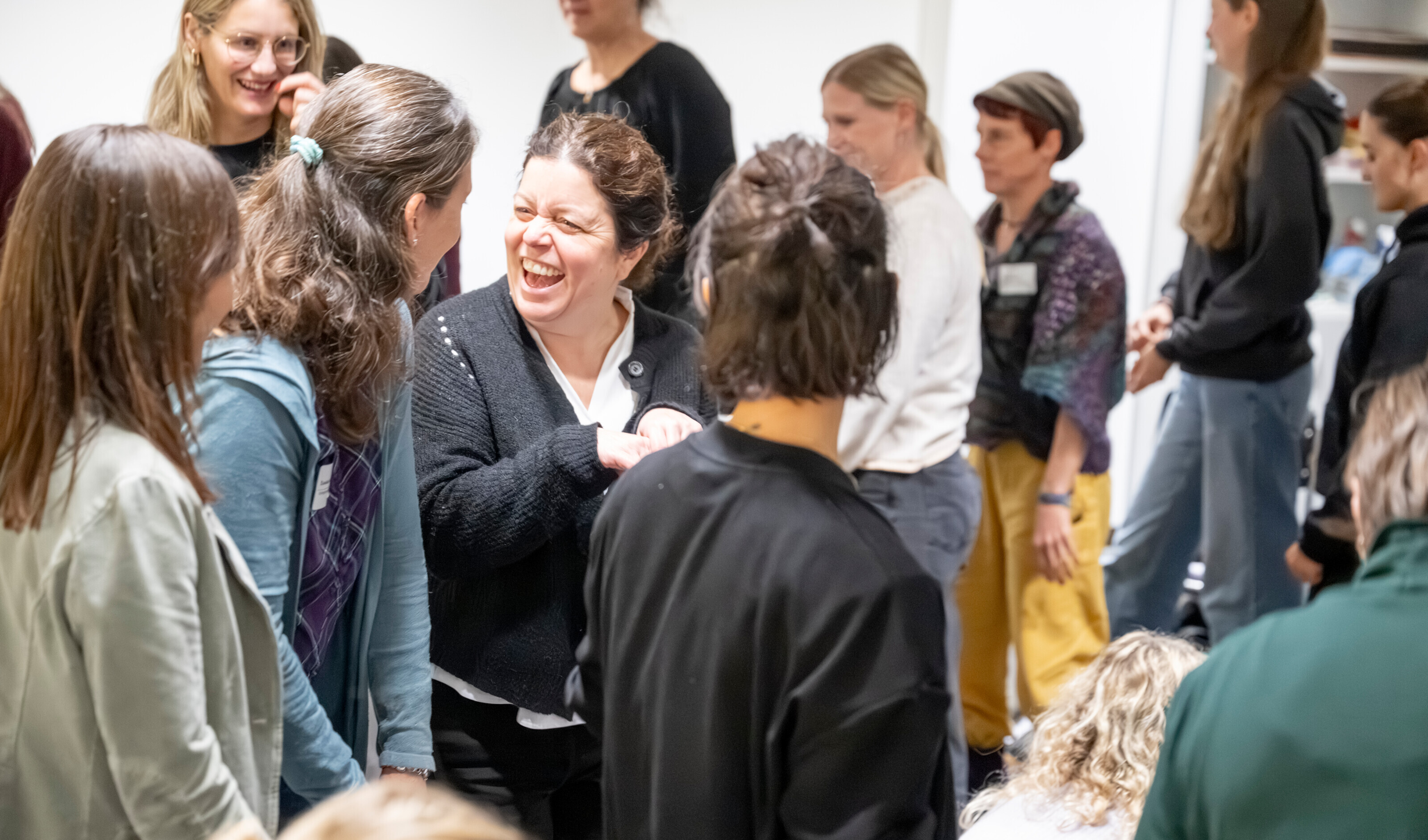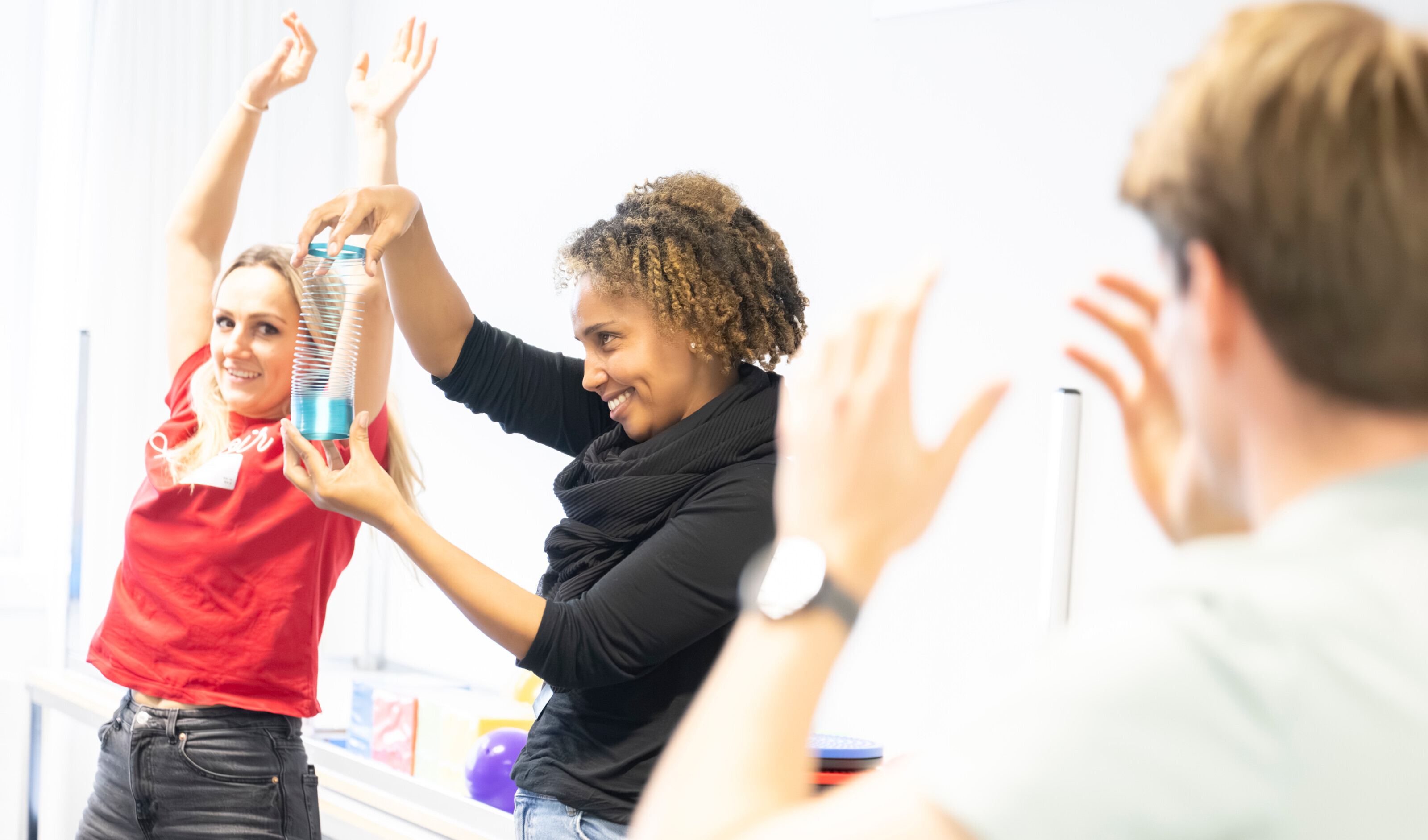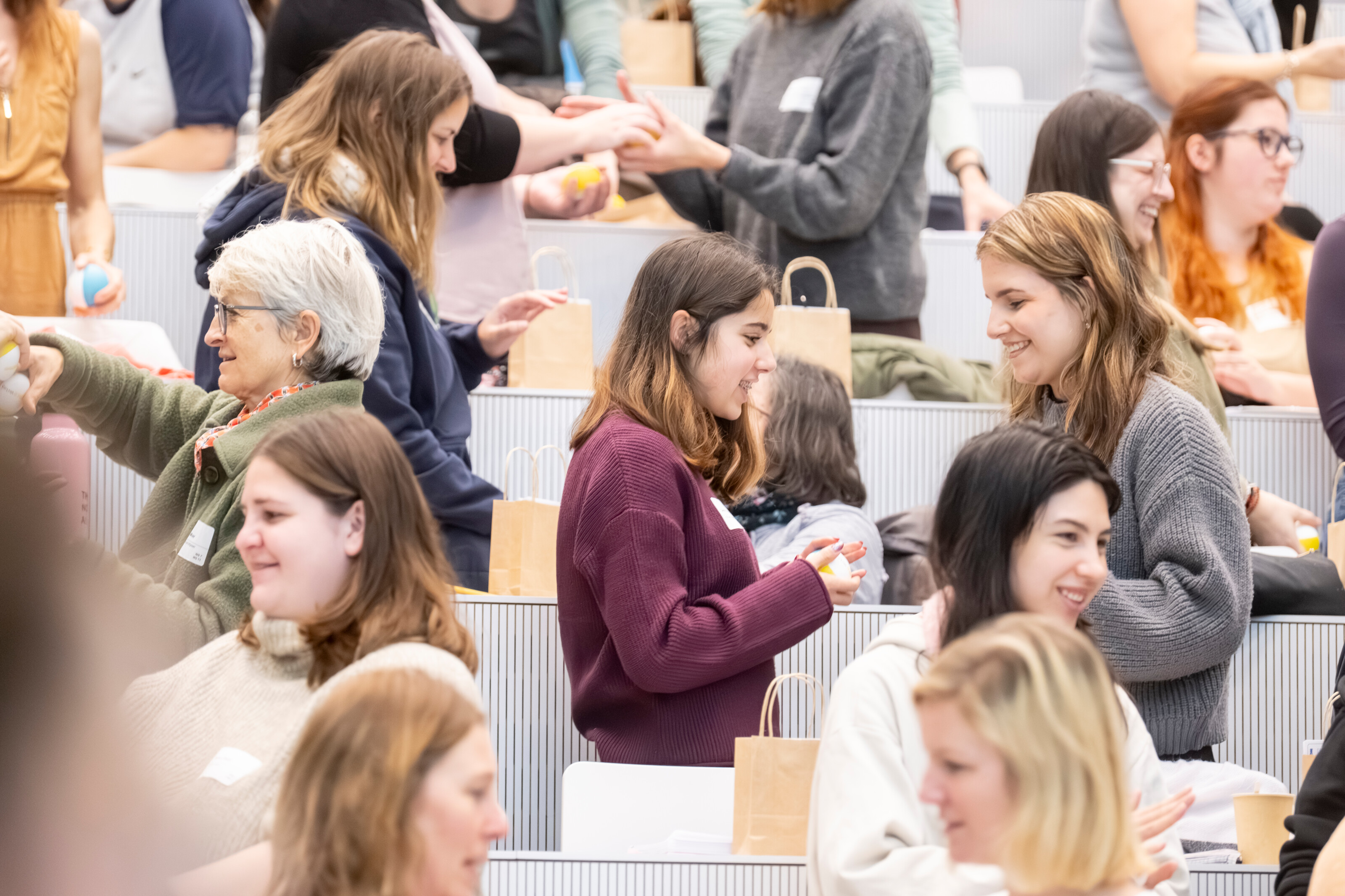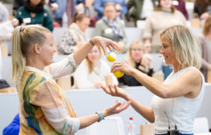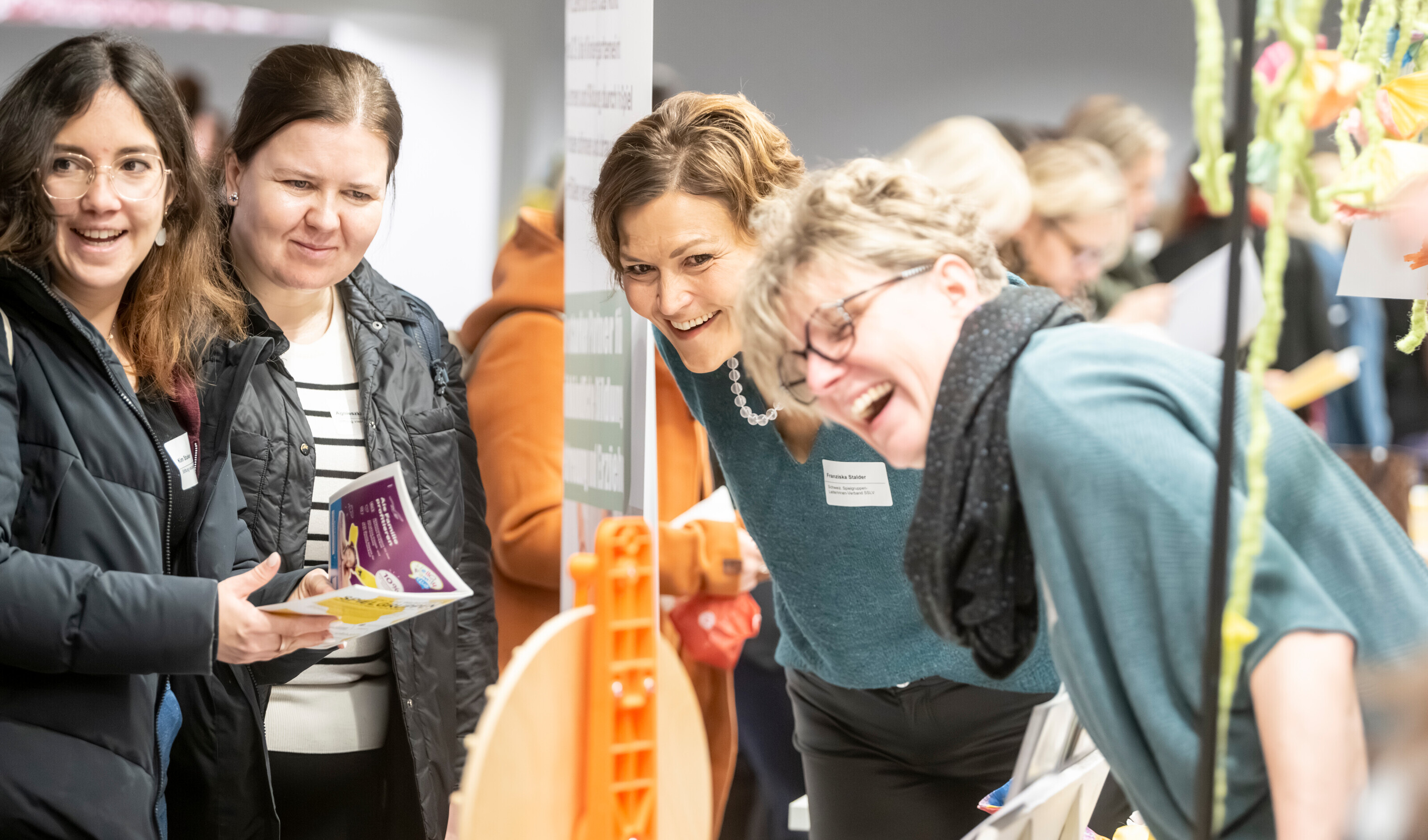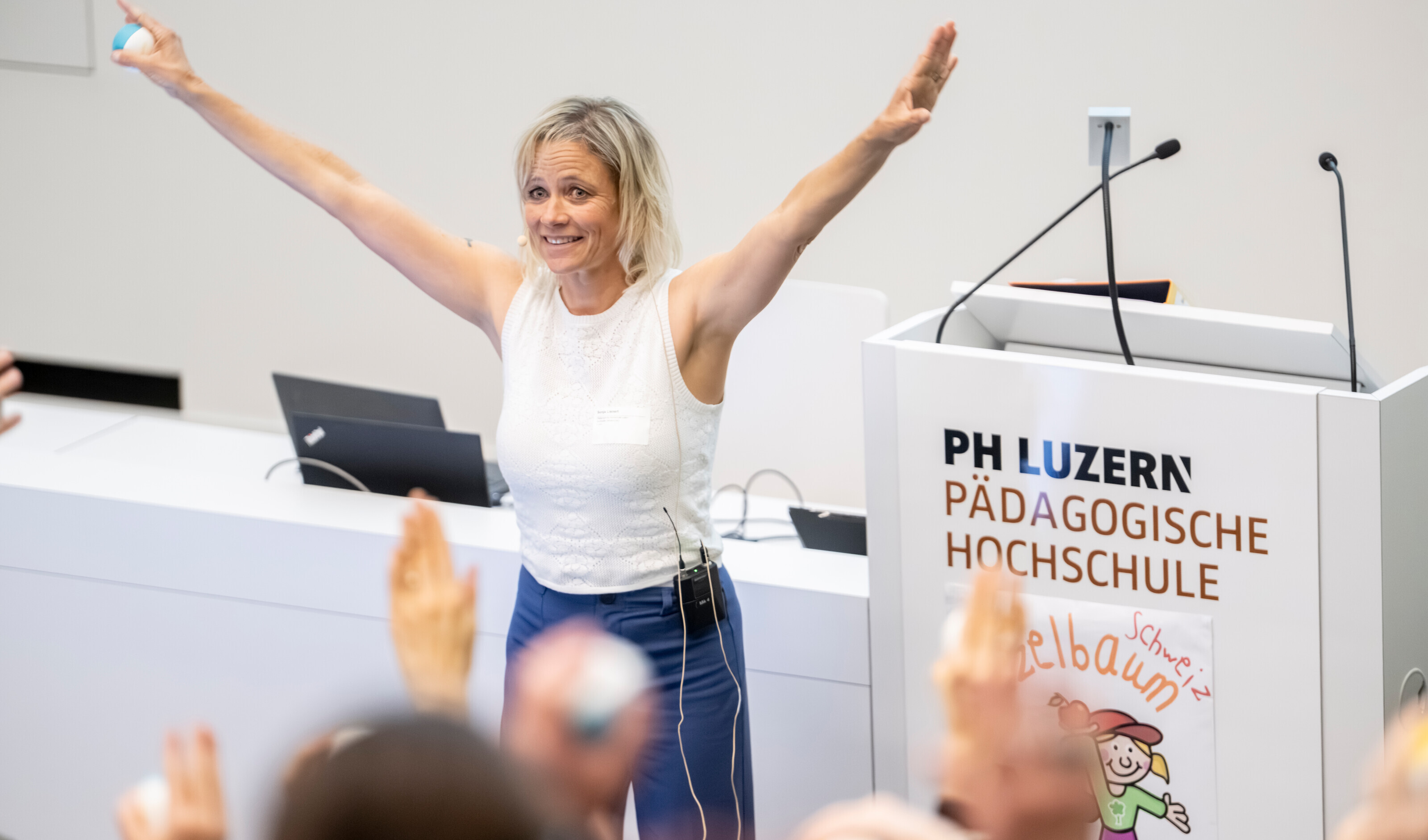 Die Teilnehmenden aus den Berufsfeldern Spielgruppe, Kita und Schule erhielten somit nebst theoretischen Impulsen auch ganz konkrete Umsetzungshilfen für ihr Berufsfeld. Dieser Praxistransfer wurde anschliessend in nicht weniger als 20 Workshops vertieft vollzogen. Das Tagungsmotto wurde aber schon vorher gelebt, denn Sonja Lienert startete ihr Referat mit Bewegungs- sowie Koordinationsübungen. Bei animierenden Umfragen zu aktuellen Fragen hiess es nicht Hand heben, sondern Aufstehen, auf einem Bein hüpfen oder in die Hocke gehen. Und wer ins Publikum blickte, sah viele lächelnde Gesichter, zufriedene Menschen. Das Motto der Tagung wurde im Hörsaal genau so gelebt wie hernach in den Workshops.