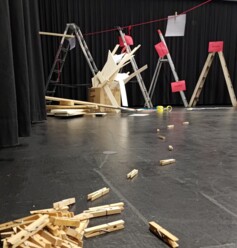 Schliesslich beflügelte die spielerische Auseinandersetzung mit Leitern, rotem Faden und Holzabschnitten in jeglicher Grösse die Fantasie und liess Stimmungen und Bilder entstehen. Die mitgebrachten Begriffe («Ein Wort, das dich übermütig werden lässt») erzeugten in Bezug zur Installation performative Miniaturen.