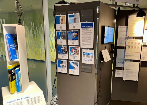 Neben schulischen Themen, die in grossem Umfang mittels scannbaren QR-Codes zugänglich sind, gibt es unter anderem auch Informationen über Weg- und Zupendler*innen, Grösse von Haushalten, Erwerbsleben, Arbeitslosigkeit und vieles mehr. Die Präsentationswände laden zum spontanen Verweilen ein, aber auch zur Vertiefung in einen Themenbereich. Hierfür ist eine App nötig, die QR-Codes lesen und online aufbereitete Zusatzinformationen für Interessierte erschliessen kann. Aber der Titel der Ausstellung ist Programm. Sie bietet «mehr als Zahlen».