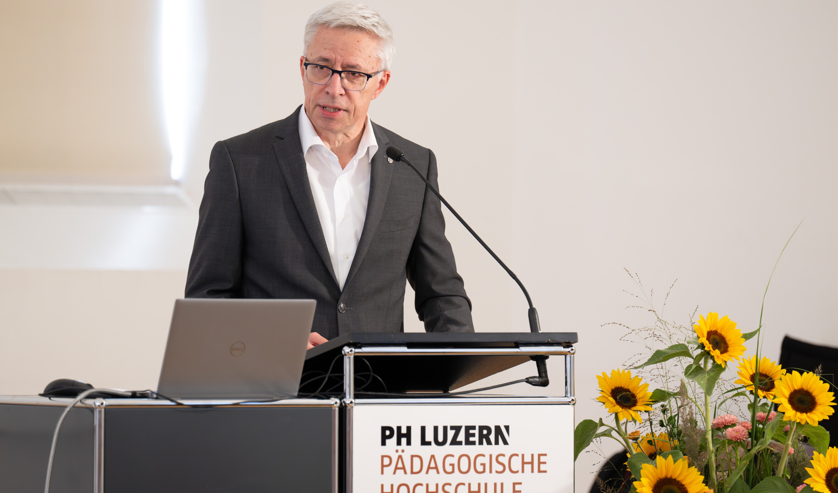 Reinhard Hölzl exemplifizierte in seiner Ansprache augenzwinkernd Möglichkeiten, dem Bildungsziel der «vertieften Gesellschaftsreife» gerecht zu werden. Als Beispiel wählte er die Frage «Lässt sich 5 durch 0 teilen?» Einerseits liesse sich im Unterricht ein Verbotsschild aufstellen – «geht nicht» –, anderseits könne man solchen «No-go’s» erst recht auf den Grund gehen und dabei Problemstellungen aus unterschiedlichen Perspektiven beurteilen. Der Prorektor Ausbildung betonte dabei auch das doppelte Kompetenzprofil in der PH-Ausbildung und insbesondere den Bezug zum Berufsfeld.