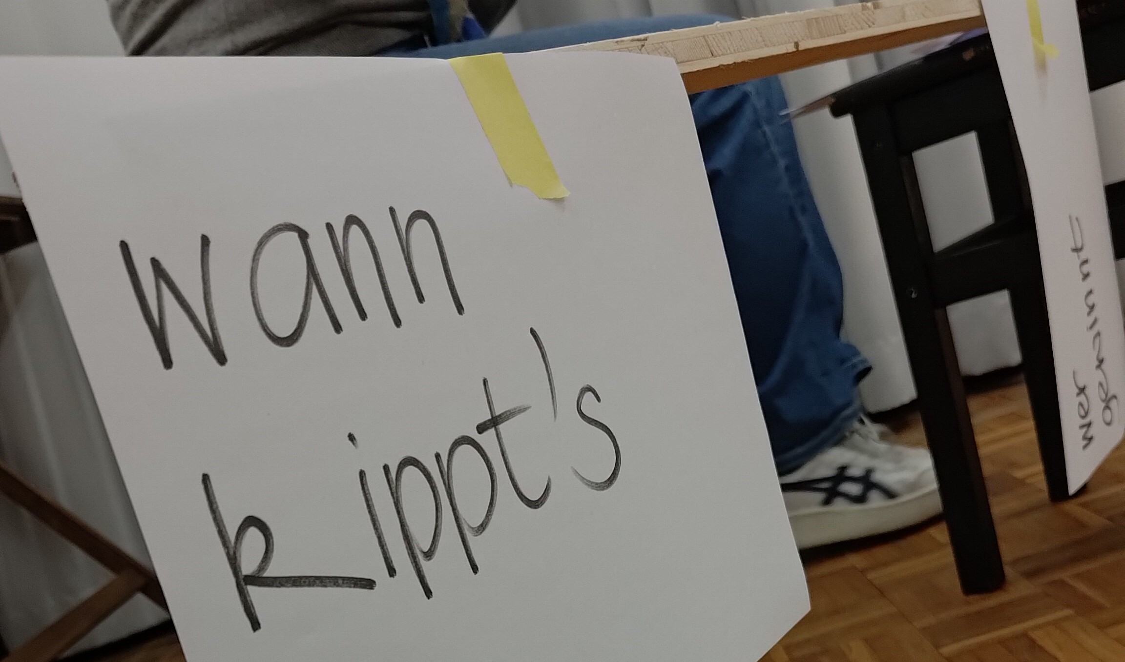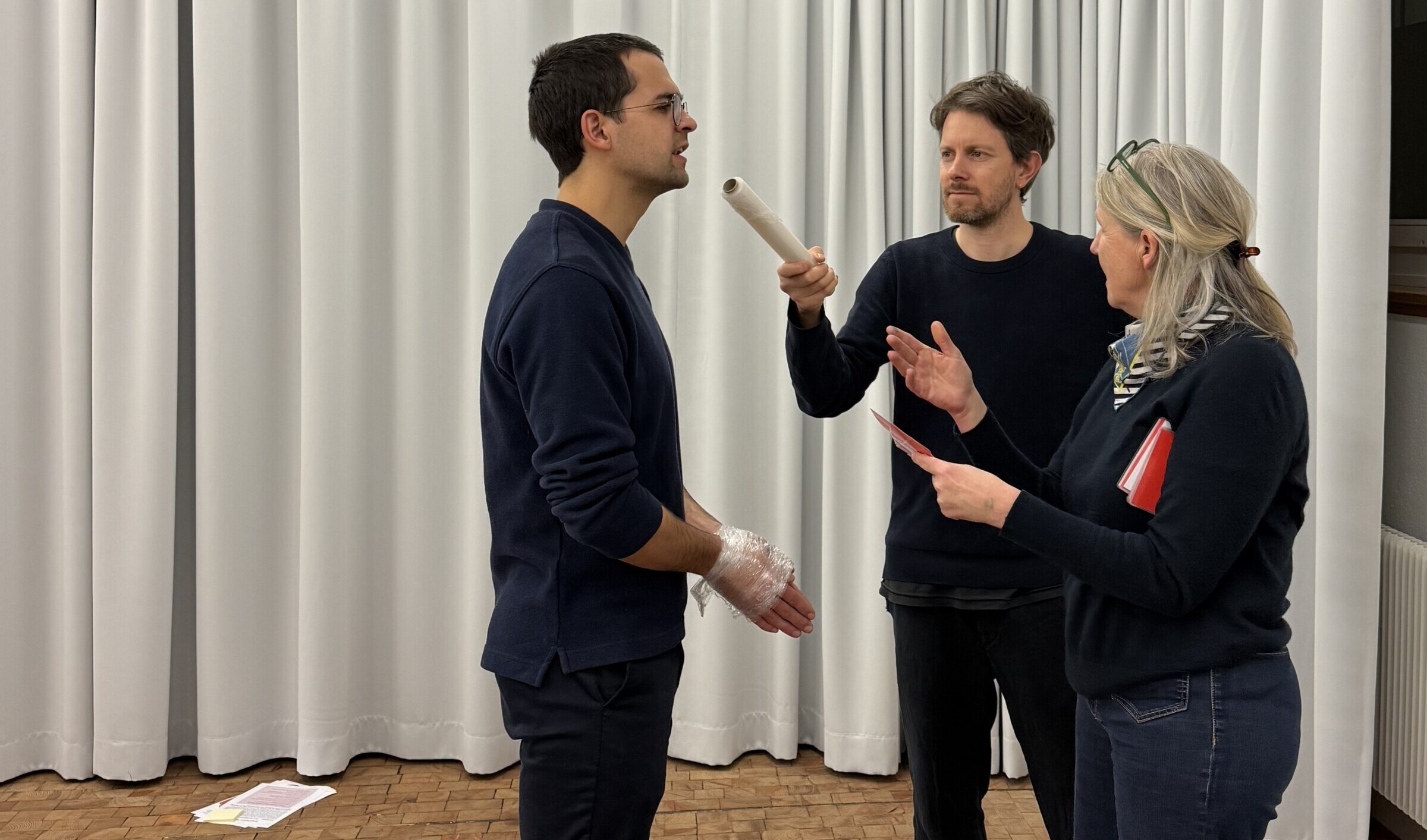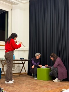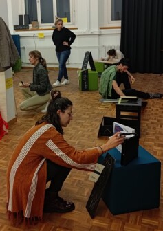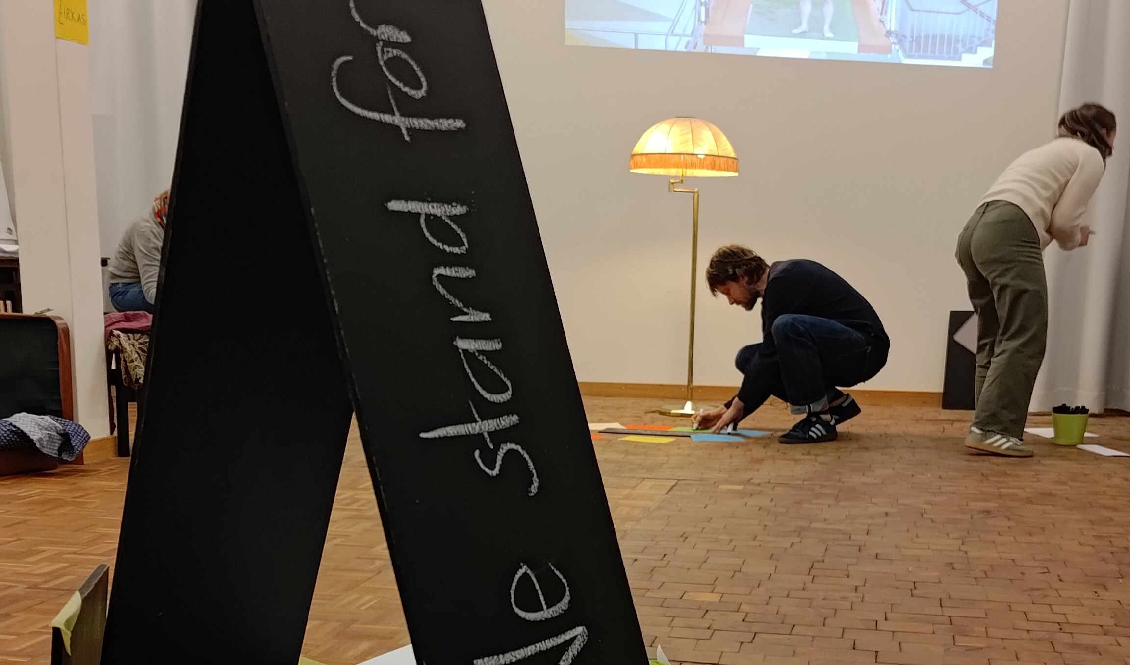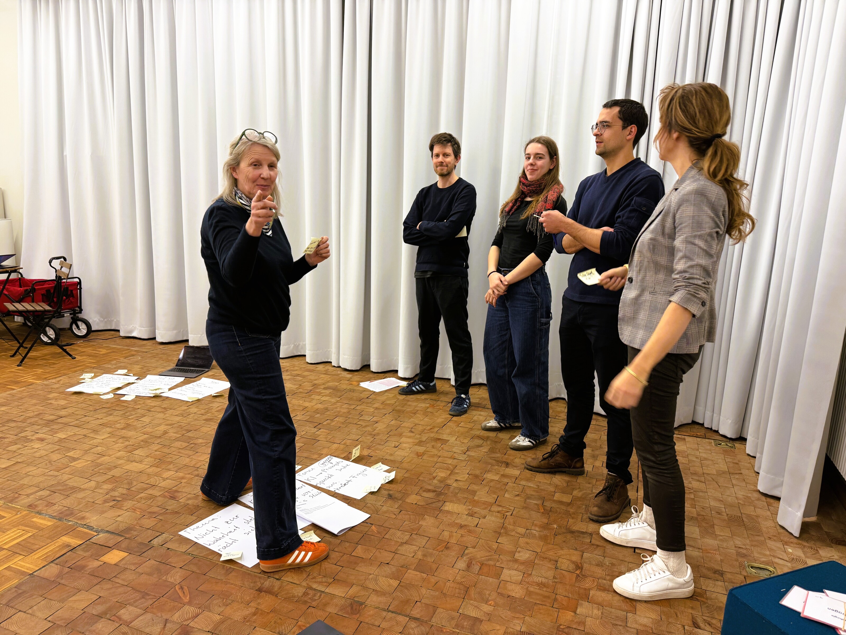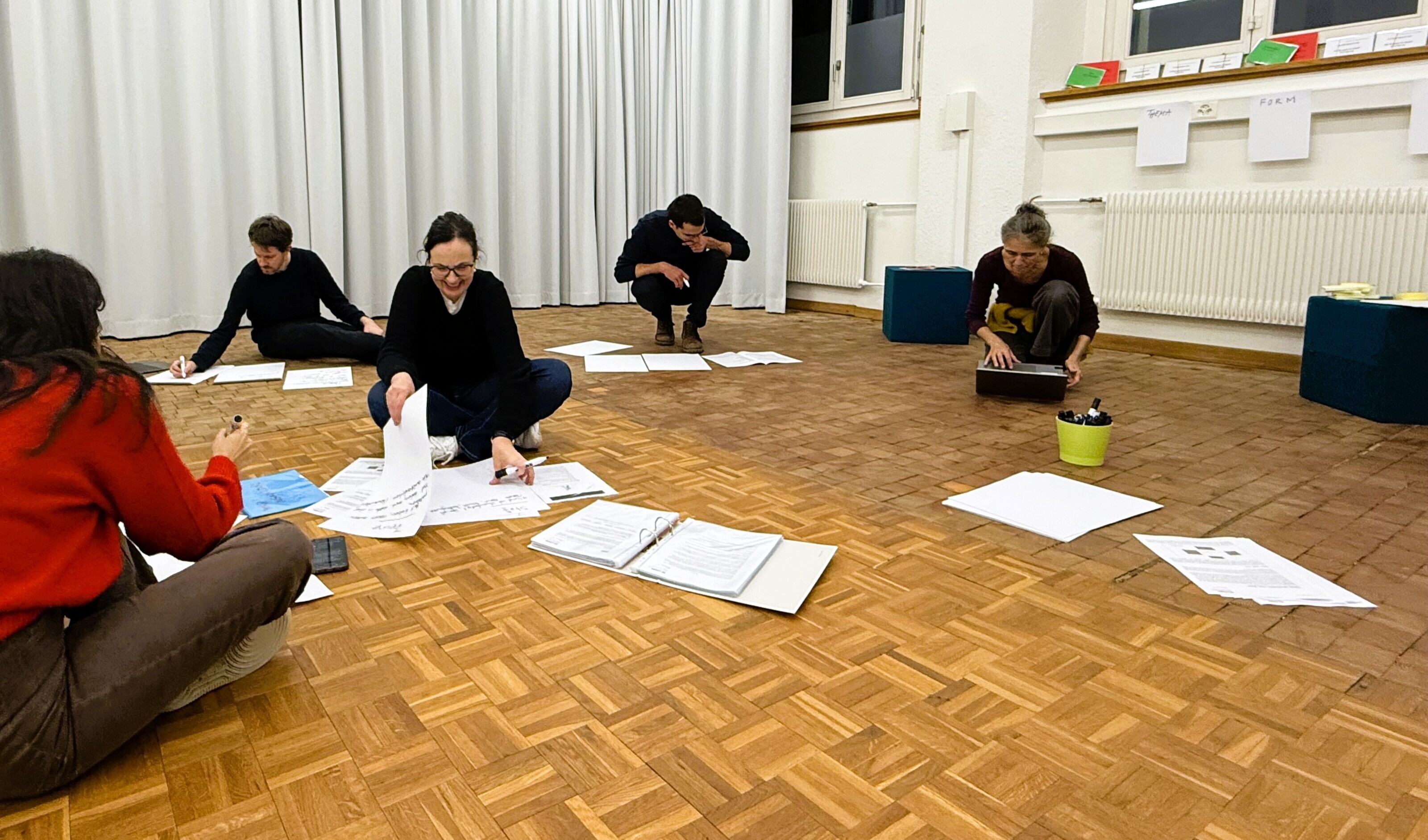 Im Zentrum der Veranstaltung stand der Austausch von Ideen und das gegenseitige Befragen und Anreichern der Projektidee. So wurden neue Fragestellungen, Textspielereien, und Gedankenschnipsel in Bezug auf die Felder «Thema, Stoff und Form» gesetzt: Was ist die Kernaussage des Stücks? Welcher Frage wollen wir nachgehen? Welche Geschichte wollen wir erzählen? Welche Figuren interessieren uns? Welcher theaterästhetischen Formen wollen wir uns bedienen? Dieses neu entstandene Material wurde sogleich durch Spiel- und Improvisationsformen szenisch erprobt. Davon ausgehend werden konkrete Umsetzungsinputs ihren Weg in die einzelnen Projektprozesse finden.