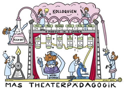 Im MAS Theaterpädagogik erwerben die Studierenden in den vier Ausbildungsfeldern «Rahmen (Kick-Off, Kolloquien, Reflexion), Module, Werkspionage und Master (Projekt und Arbeit)» fachliche wie theoretische Kenntnisse für ihre eigene Vermittlungs- und Theaterpraxis.